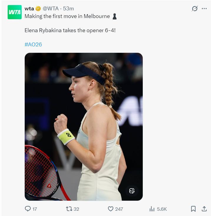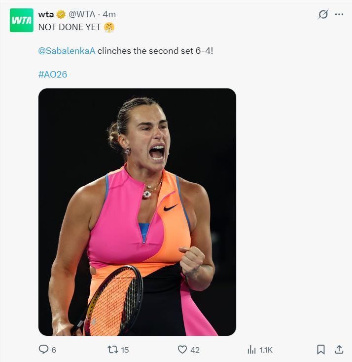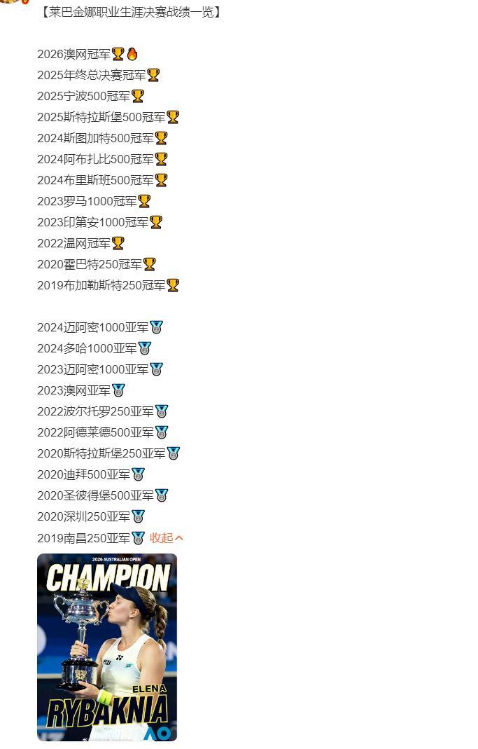 北京時間1月31日,澳網女單決賽,萊巴金娜(五號種子)2-1擊敗薩巴倫卡(一號種子奪冠),三盤比分:6-4、4-6、6-4。萊巴金娜在決勝盤0-3落後的情況下連贏五局,她職業生涯首次拿到澳網女單冠軍,也是她個人第二個大滿貫冠軍。