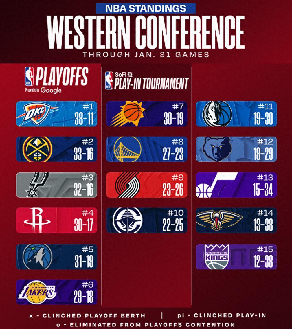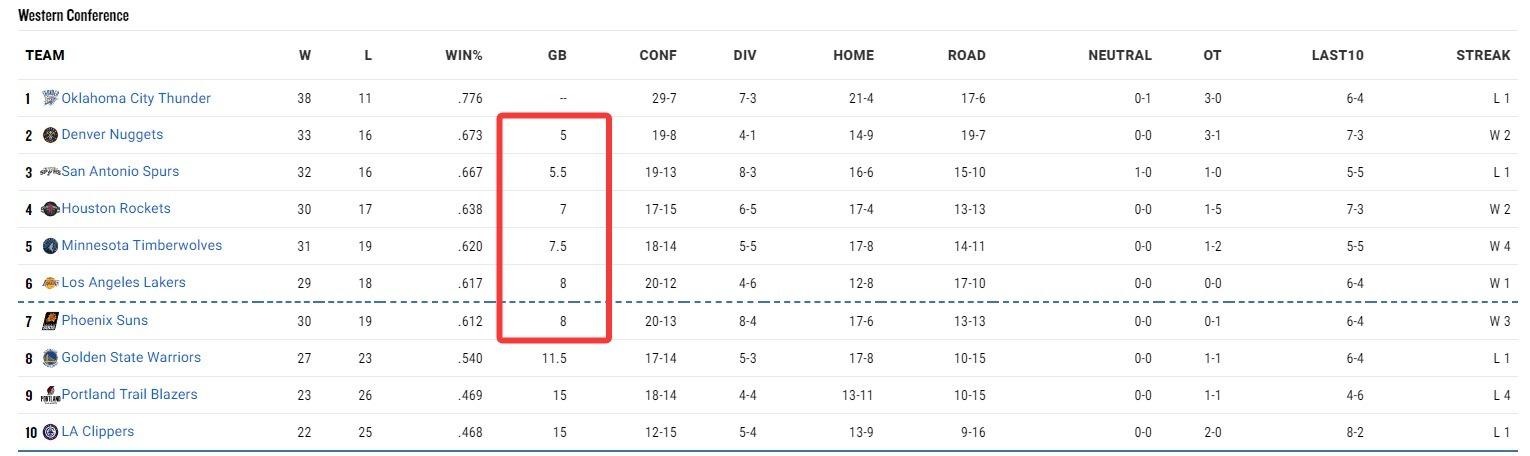 火箭跟馬刺只差1.5個勝場,森林狼與火箭只差0.5個勝場,湖人距離森林狼0.5個勝場,太陽跟湖人沒有勝場差,只要湖人輸球/太陽贏球,那麼湖人就會掉到附加賽。