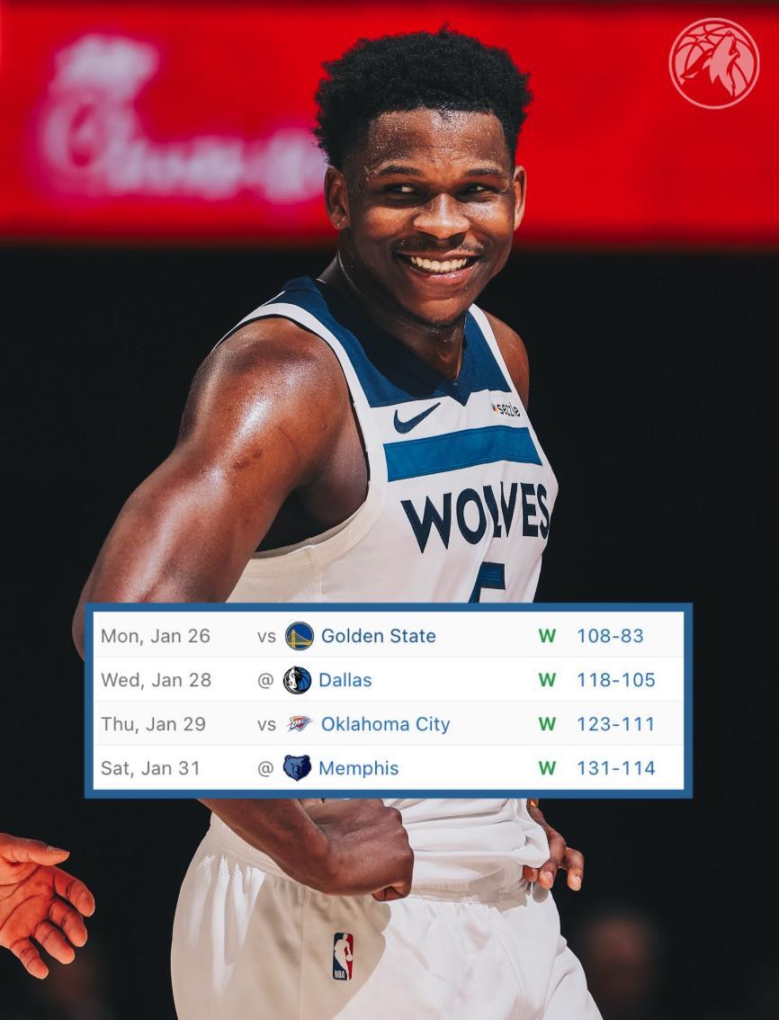 森林狼131-114大勝灰熊拿到四連勝,愛德華茲拿到33分3助攻,蘭德爾27+7+7,麥克丹尼爾斯20+4,裏德20分9籃板5助攻,森林狼這一波四連勝後已經穩穩壓制湖人、太陽,他們險些跟火箭的勝場持平,但火箭擊敗獨行俠後再度領先森林狼0.5個勝場。
