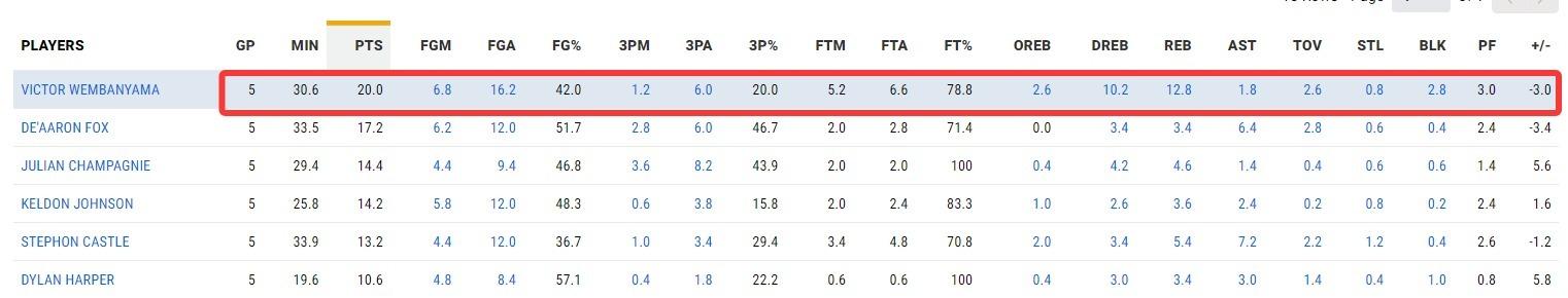 過去的五場比賽文班亞馬場均30.6分鐘,拿到20分12.8籃板1.8助攻0.8搶斷2.8蓋帽2.8失誤,命中率42%,三分命中率20%(場均出手6個三分球),這也難怪文班亞馬被批判已經變爲魯迪-戈貝爾了。