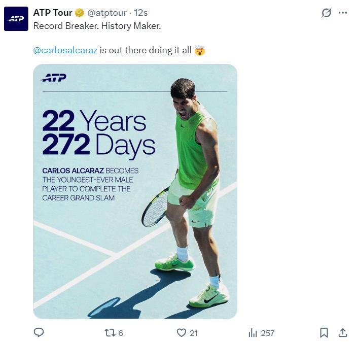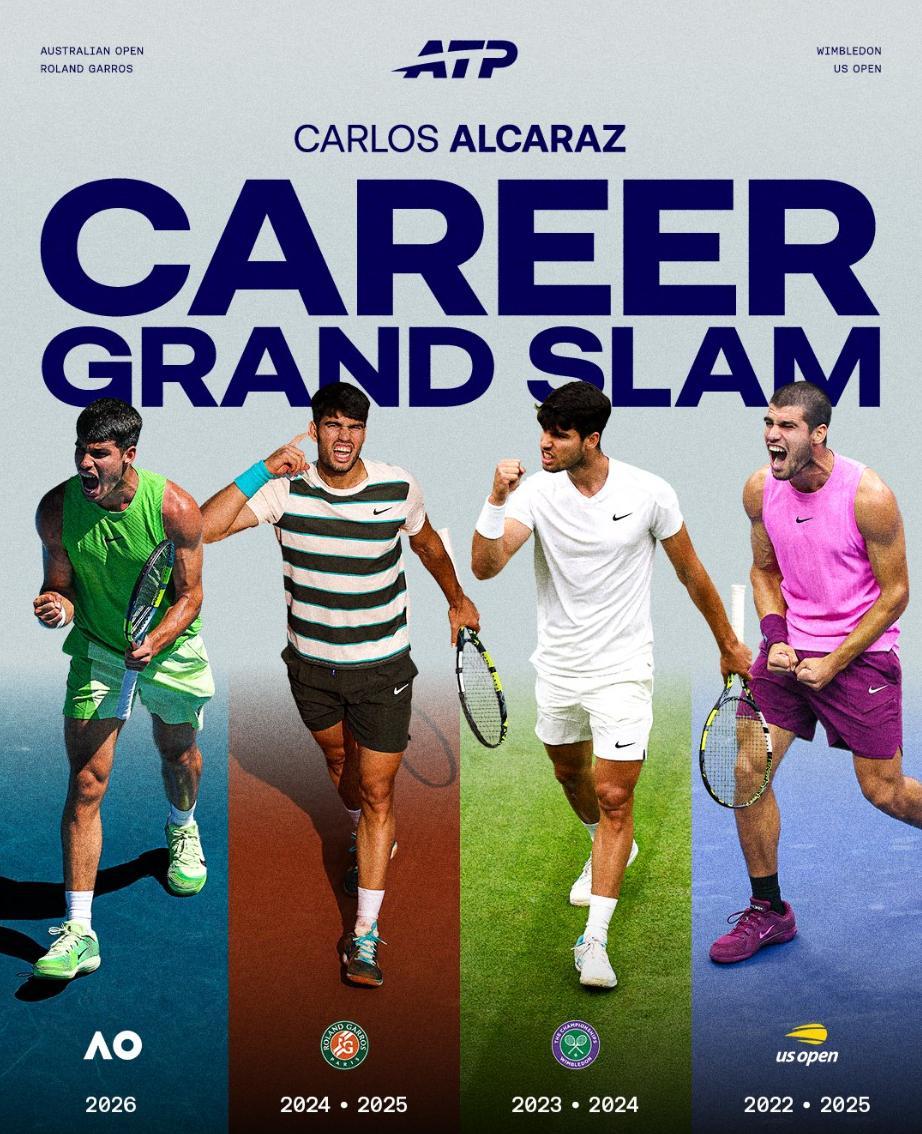 2026澳網是阿卡豐收的大賽,他生涯首次闖入澳網4強就拿到了冠軍,他超越24歲的納達爾成爲公開賽年代最年輕的男子‘全滿貫’選手,目前阿爾卡拉斯只有22歲272天,ATP官方寫道:紀錄的創造者、歷史的締造者。