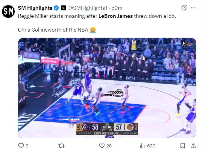 這場比賽41歲的勒布朗-詹姆斯又成爲麥迪遜廣場花園最閃耀的那顆星,他在上半場就完成了一次空接暴扣,這一球斯瑪特傳給他恰到好處,詹姆斯高高躍起完成了平筐空接。