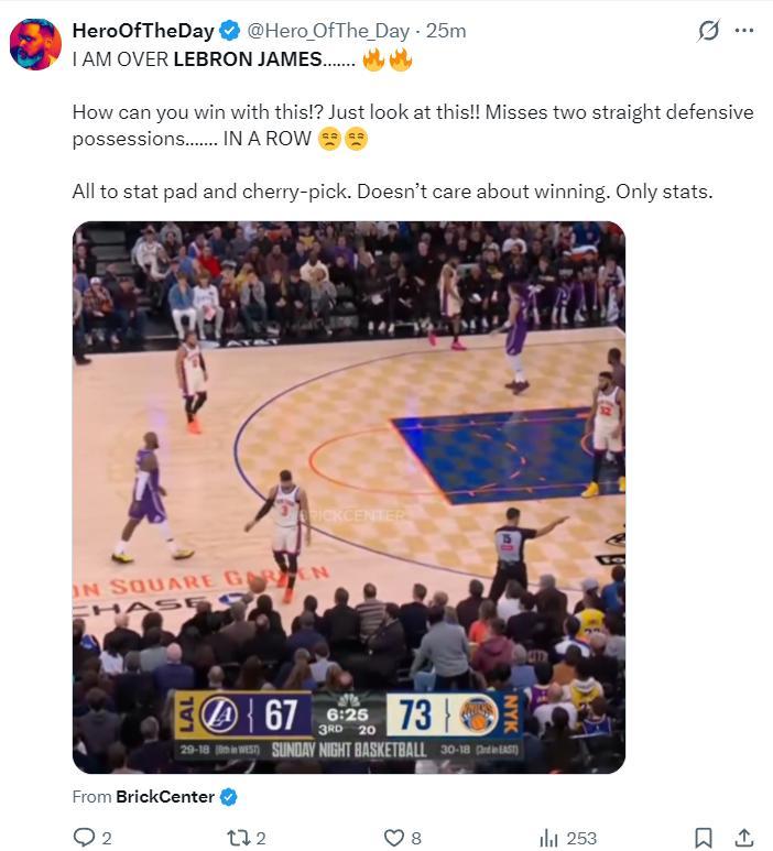 著名詹黑媒體賽後吐槽勒布朗的防守(正好就是湖人第三節崩盤的開始):我對勒布朗-詹姆斯已經厭倦了,他這樣打球怎麼可能贏?看看這個瞬間吧,連續兩個防守回合都漏人,他只顧着刷數據、挑有利數據的位置,他根本不在乎輸贏,只在乎數據。