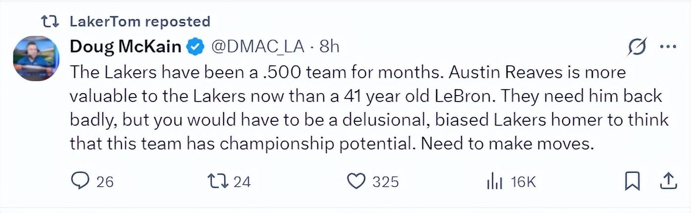 湖人記者Doug McKain賽後評論道:湖人已經連續數月勝率在50%,奧斯汀-裏夫斯對湖人而言的重要性遠超過41歲的詹姆斯,湖人迫切希望裏夫斯迴歸,但你是個狂熱的湖人球迷認爲湖人一定要奪冠,那你一定是精神錯亂或偏見了,因爲這支球隊根本沒有奪冠實力,除非他們採取行動。