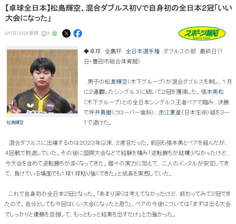 一天之前,18歲的松島輝空剛剛搭檔17歲的張本美和在全日本錦標賽上拿到了混雙冠軍,他們在決賽是3-0橫掃3-0坪井勇磨/赤江夏星,三局比分:【11-4,12-10,11-9】。