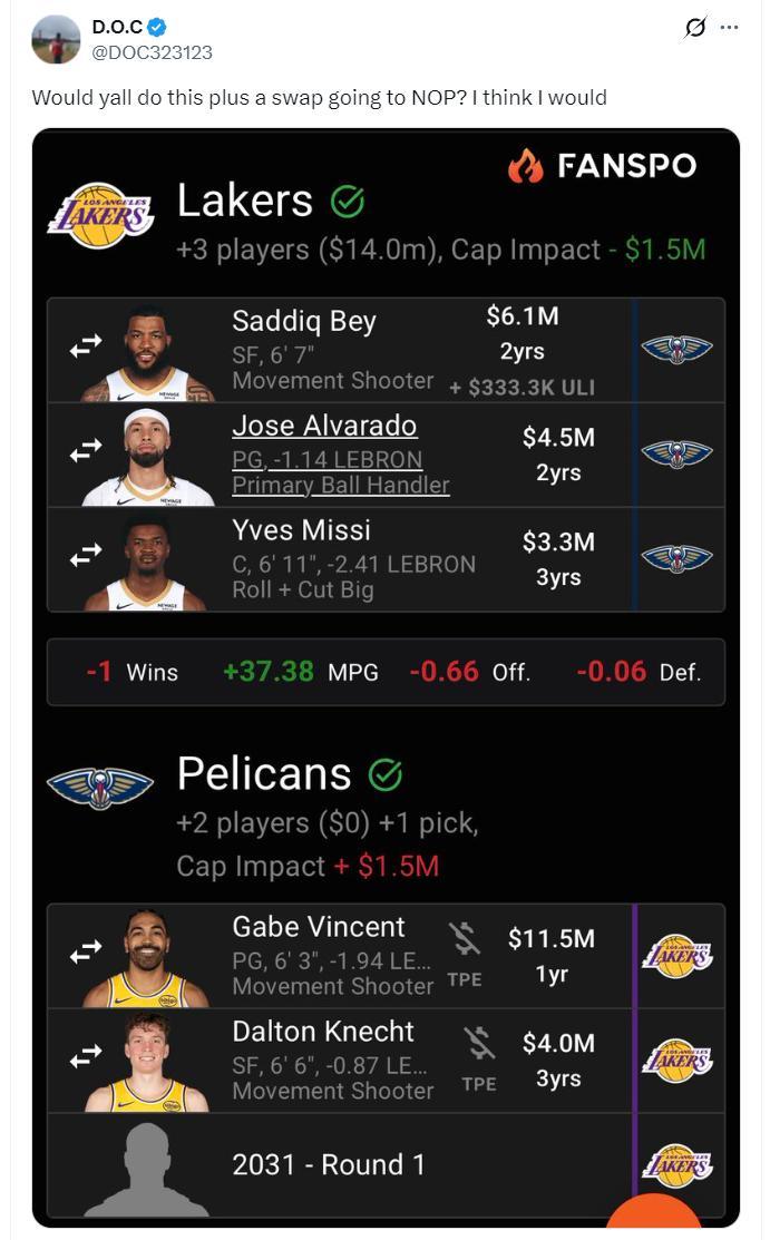 很明顯這個交易的難點就是湖人是否願意犧牲他們2031年的首輪籤,佩林卡一向把首輪籤看的很重要,兩個首輪17號籤都不肯交易,結果一個選了希菲諾,一個選了克內克特,最終都難堪大用。
