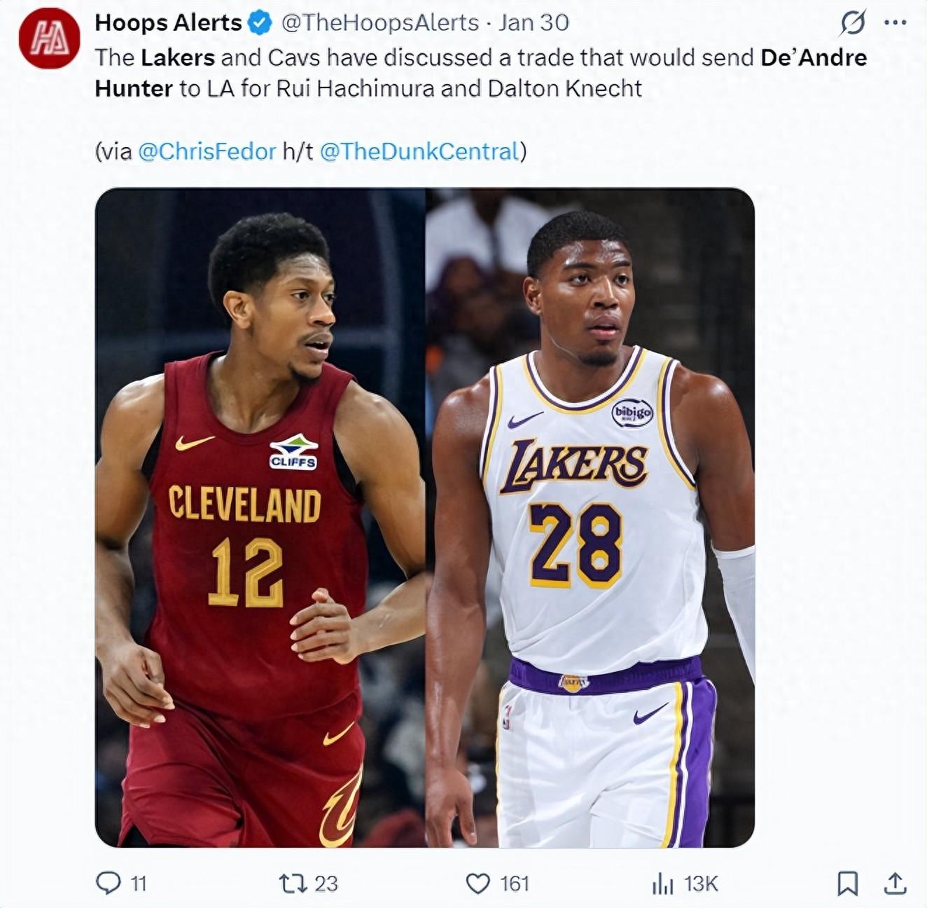 1月30日時,騎士隊記者克里斯-菲德爾就透露,騎士與湖人探索過關於亨特的交易,湖人希望用克內克特、八村壘去換亨特。