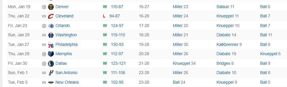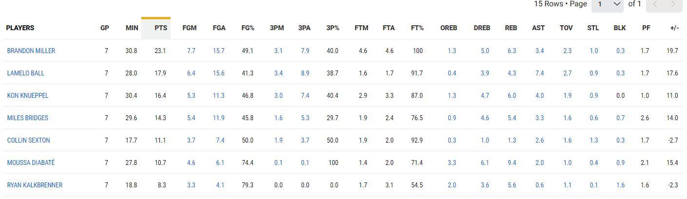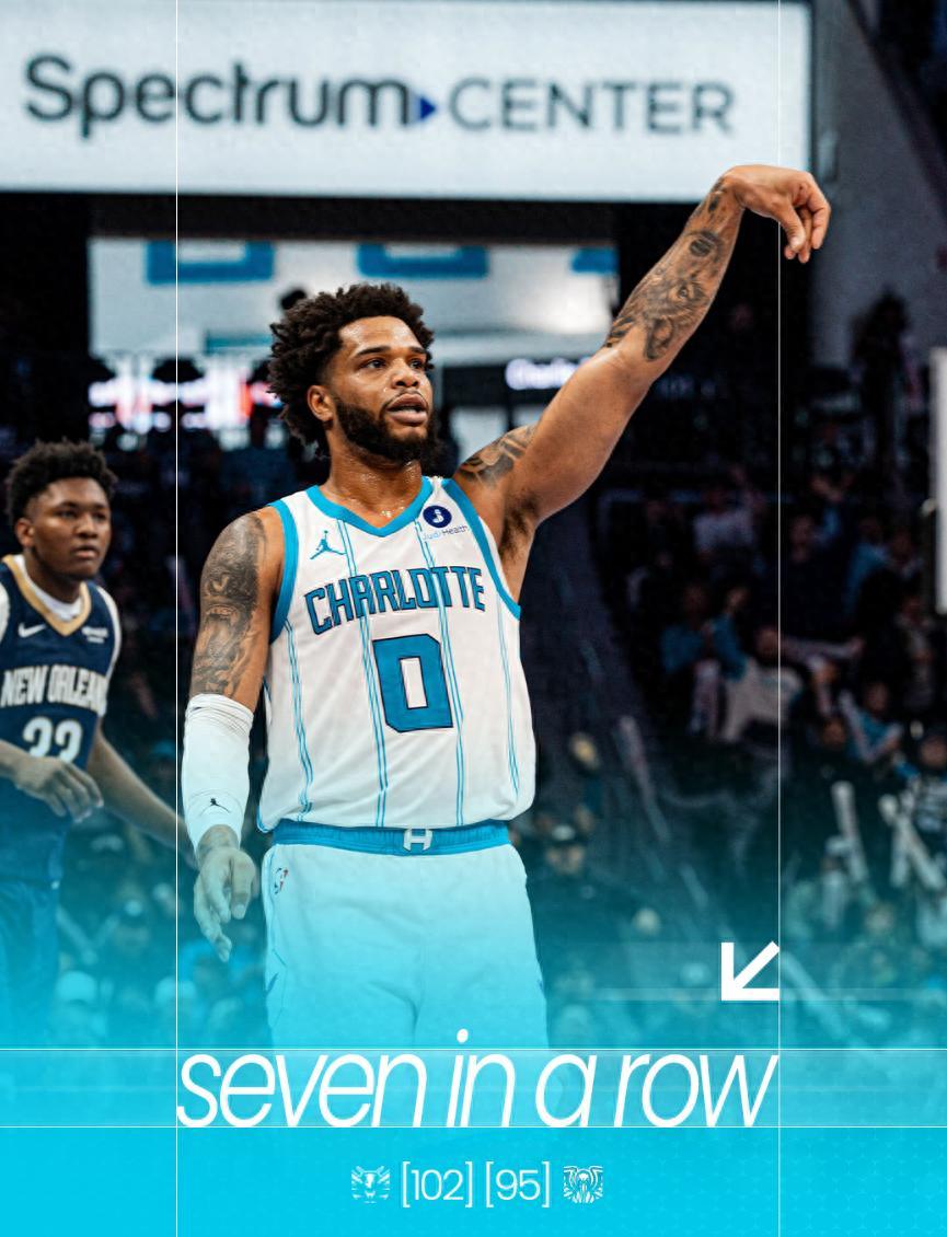 這一波七連勝中黃蜂全隊有6人場均得分都上雙:米勒23.1分、鮑爾17.9分,克努佩爾16.4分、布里奇斯14.3分、塞克斯頓11.1分、迪亞巴特10.7分。