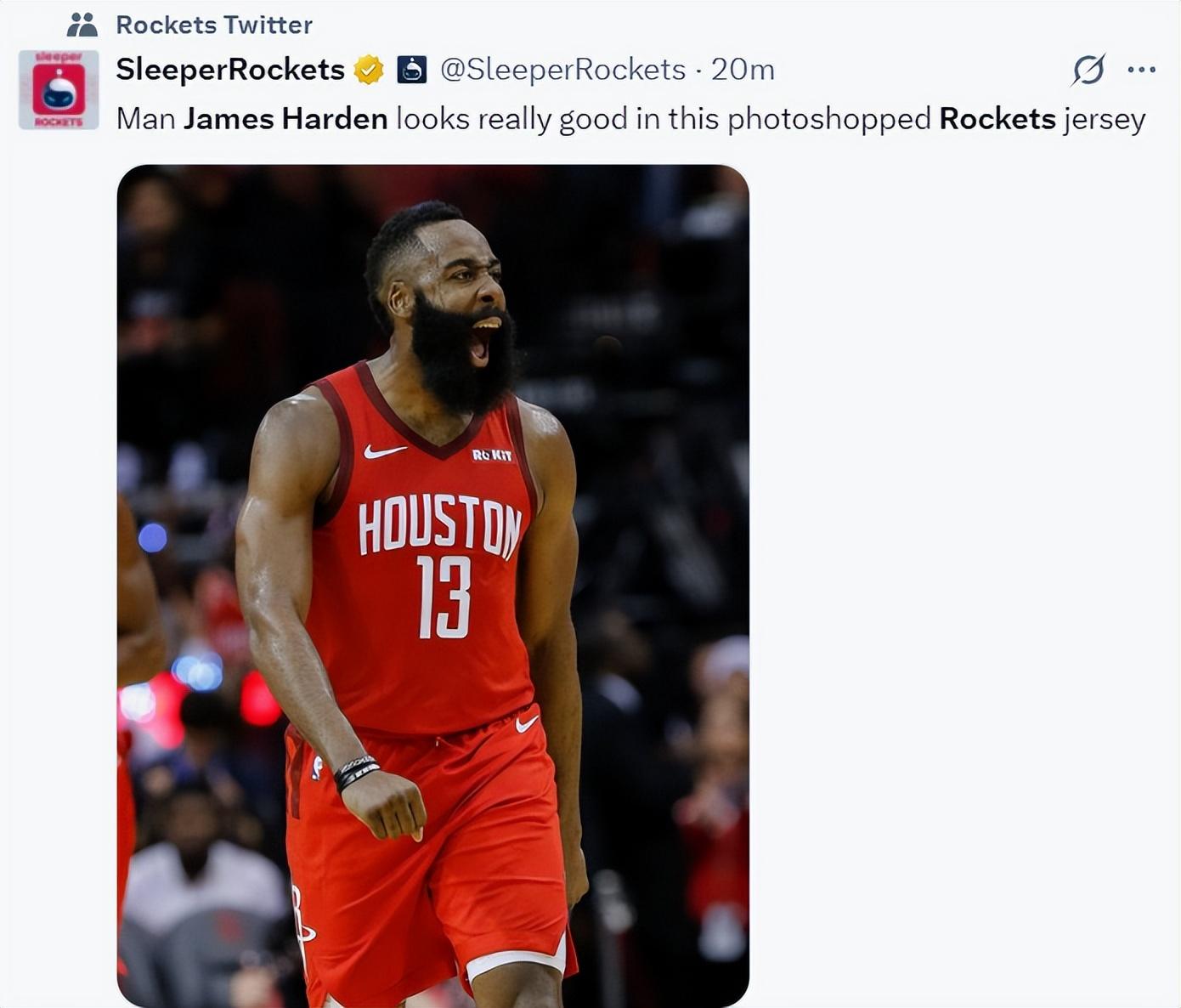 休媒SR寫道:這張哈登“PS”的火箭球衣照片看起來他的狀態非常之好。
