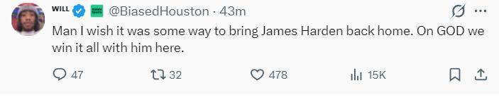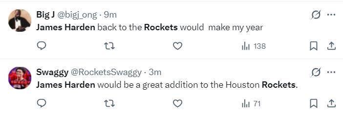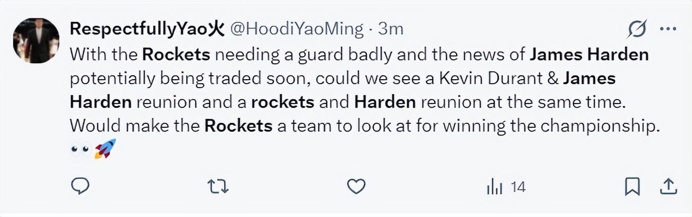 哈登可能重返休斯頓的消息出爐後,火箭球迷們紛紛發聲:火箭急需一名控球后衛,哈登即將被交易的消息傳出,我們有機會看到杜蘭特、哈登第三次攜手,如果這兩人在休斯頓重聚,我們有希望拿到總冠軍。