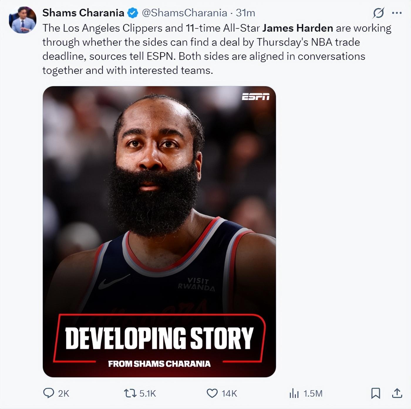 賽季至今哈登出戰44場比賽,場均35.4分鐘,拿到25.4分4.8籃板8.1助攻1.3搶斷,命中率41.9%,哈登託底能力有目共睹,根據Shams所說哈登也有意在交易截止日離開快船,現在是快船、哈登雙方都在努力將他送到一支更具競爭力的球隊。