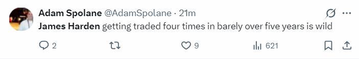 火箭記者Adam Spolane回應:詹姆斯-哈登這個級別的球星在過去的五年裏即將被交易第四次,這實在是太瘋狂了。