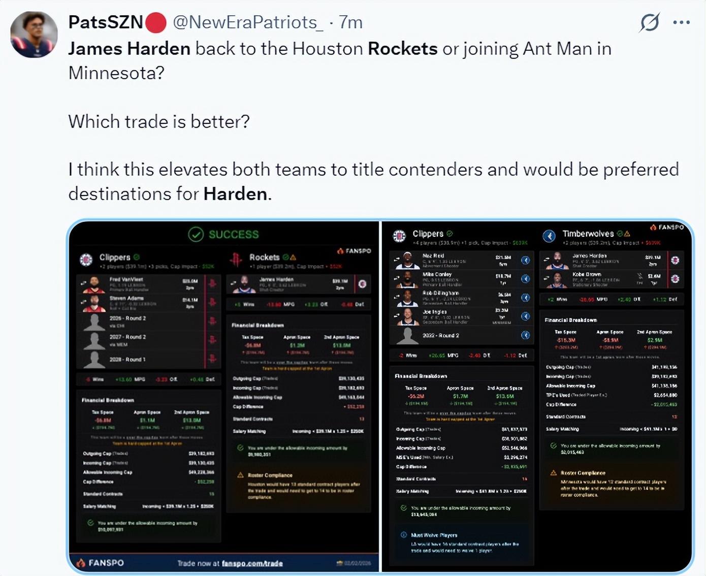 美媒PSAN模擬了一套火箭交易得到哈登的方案,那就是火箭送出範弗利特、亞當斯、2028年首輪籤、2026年黃蜂次輪、2027年灰熊次輪得到哈登,也就是5換的1方案。哈登本賽季薪水3918萬,範喬丹+海王剛好配平。