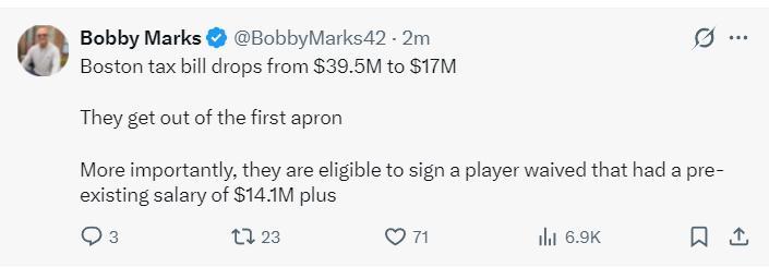 綠凱也成功從第一奢侈稅徵點上下來了,更關鍵的是,他們有資格裁掉一位球員,該球員此前的薪水爲1410萬美元。