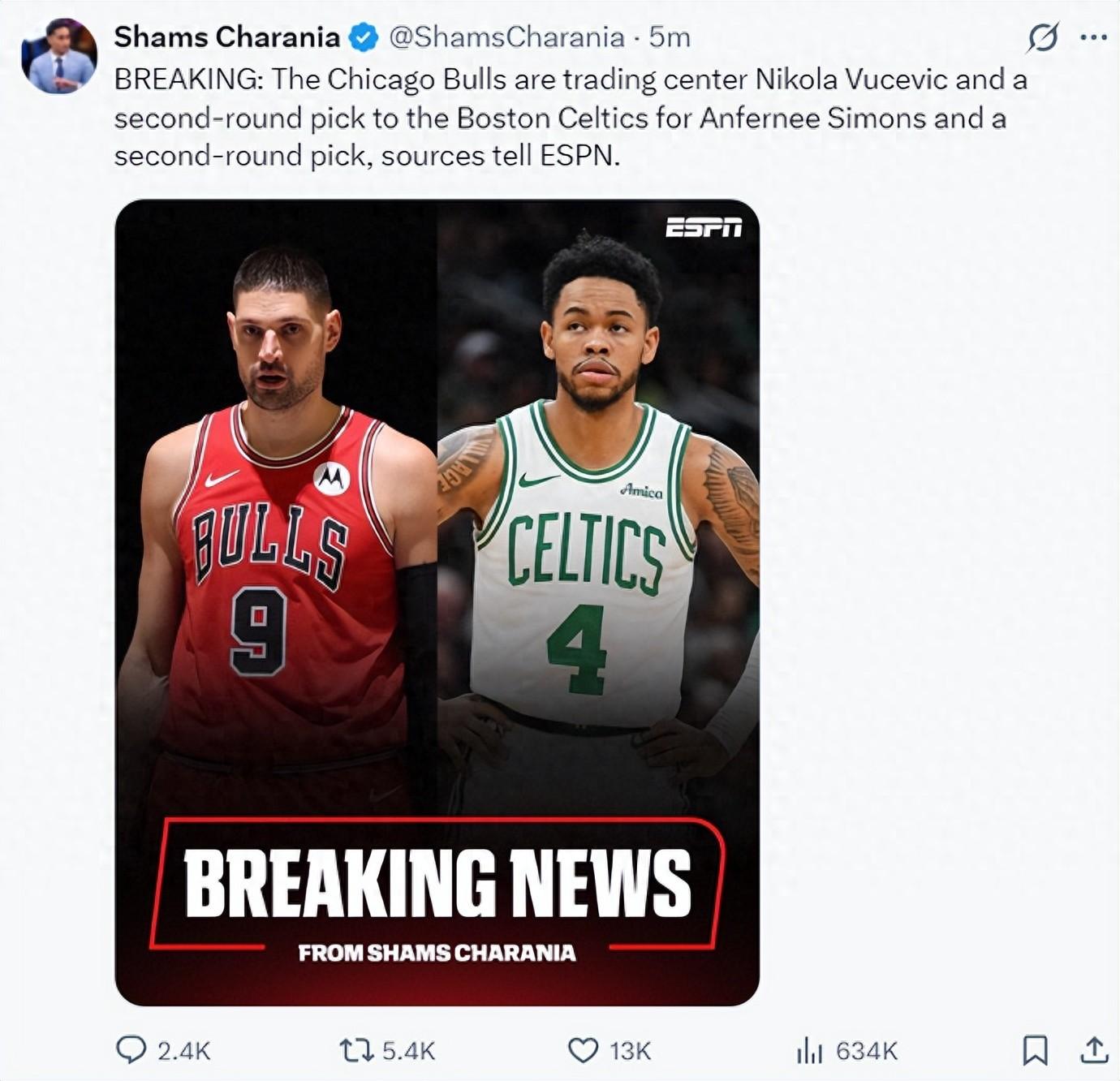 北京時間2月4日凌晨,ESPN名記Shams繼續爆料,芝加哥公牛與波士頓凱爾特人達成交易,尼古拉-武切維奇+1個次輪籤與安芬尼-西蒙斯+1個次輪籤進行了互換。