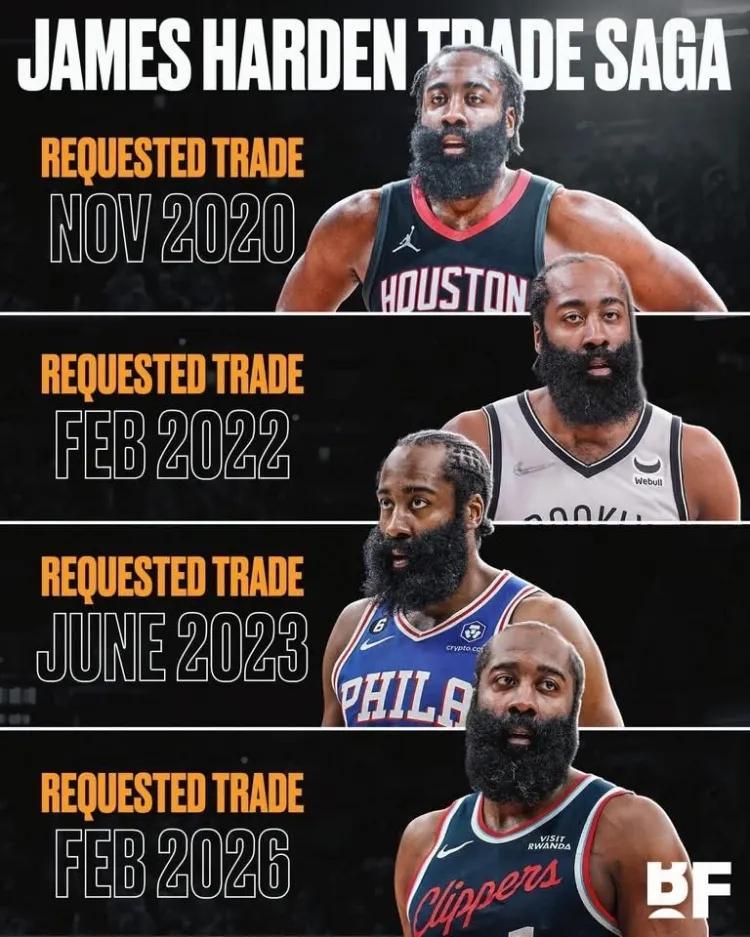 騎士將成爲哈登過去6年的第5支球隊,此前輾轉火箭、籃網、數字人、快船。
