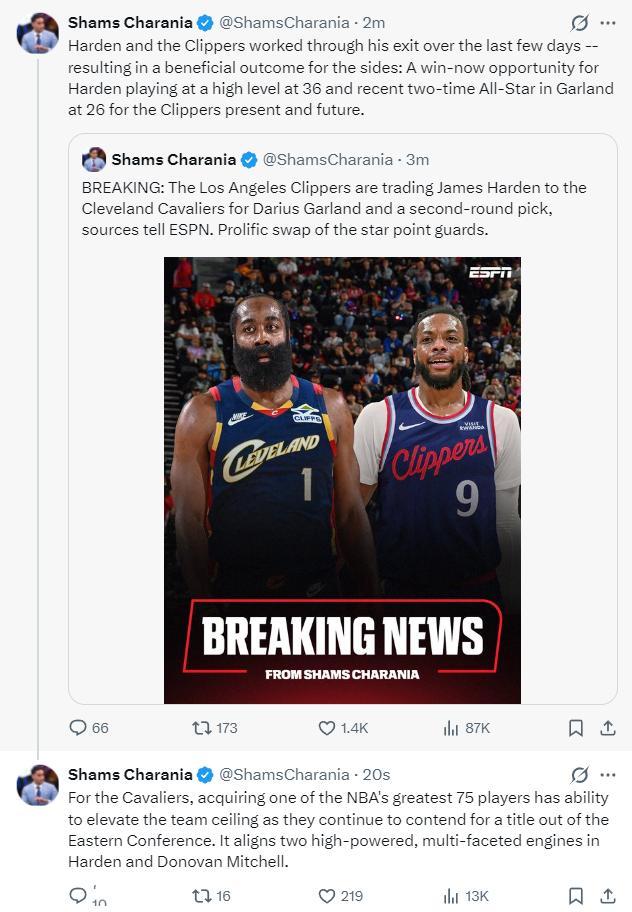 Shams表示:對於騎士隊而來他們得到了NBA歷史75大巨星,球隊的硬實力再度提升,讓他們在東區繼續具有衝冠競爭力。米切爾、哈登的後場組合實力很強,而且兩人都可以打雙能衛的全明星。