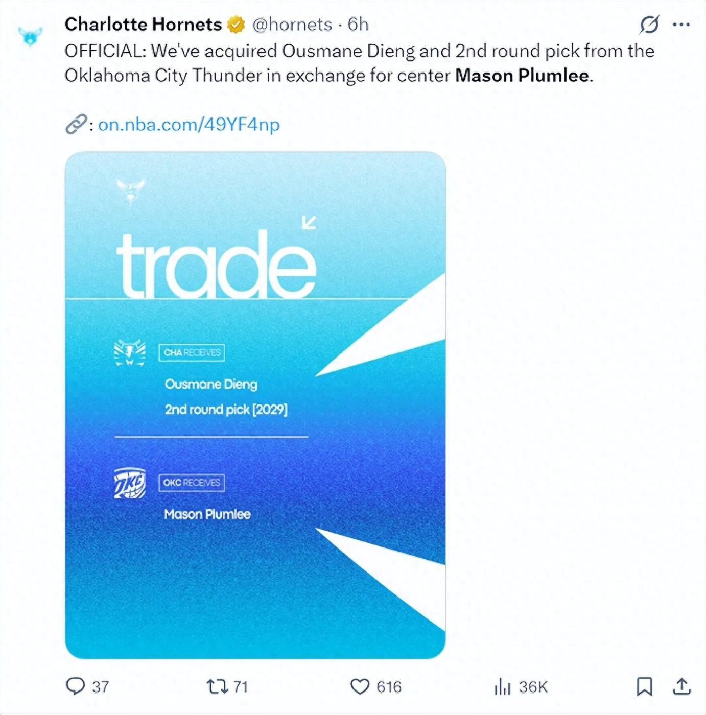 這三筆交易結束後黃蜂隊在未來的七年裏手握11個首輪籤與14個次輪籤,黃蜂的未來依舊一片光明。