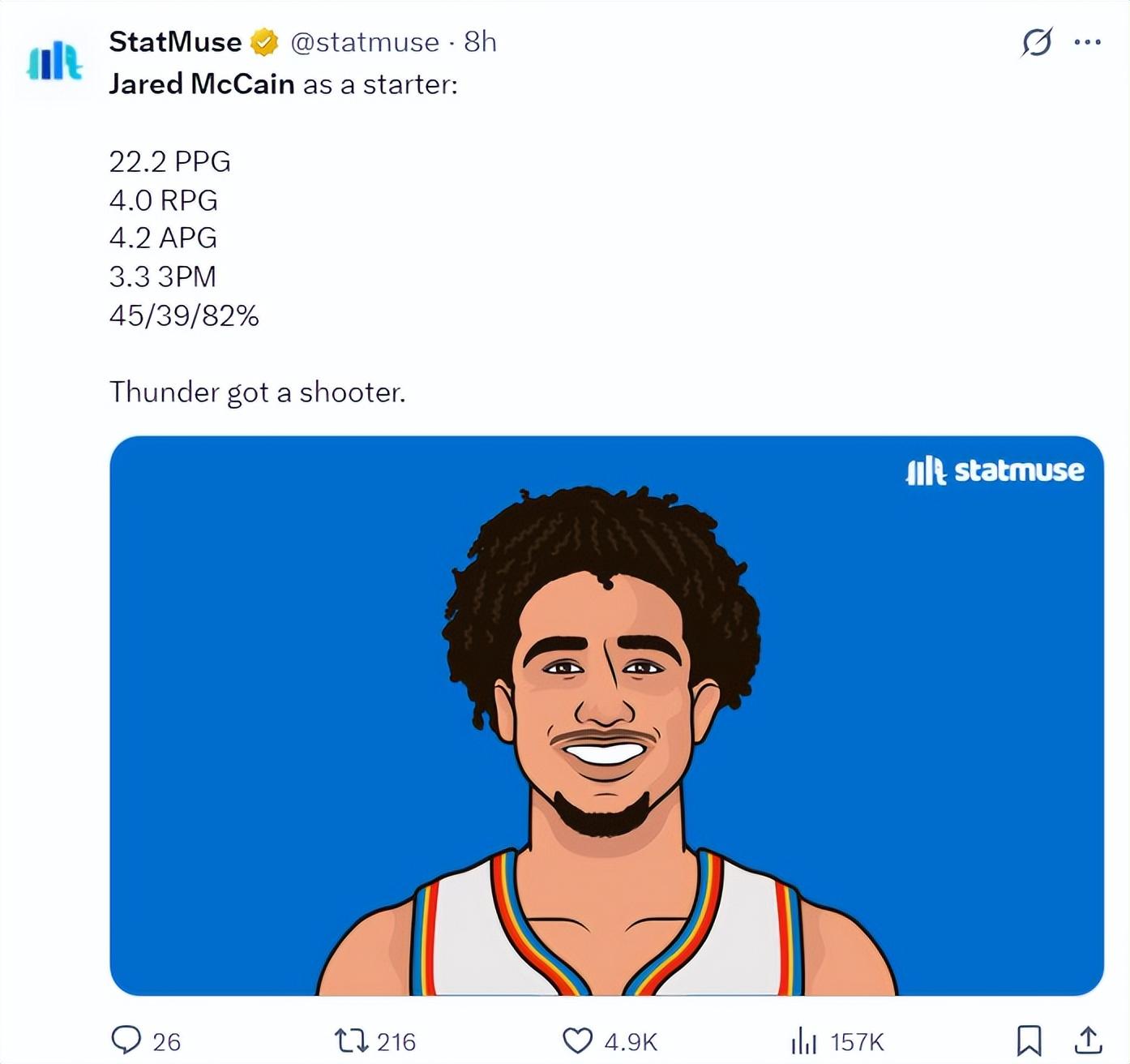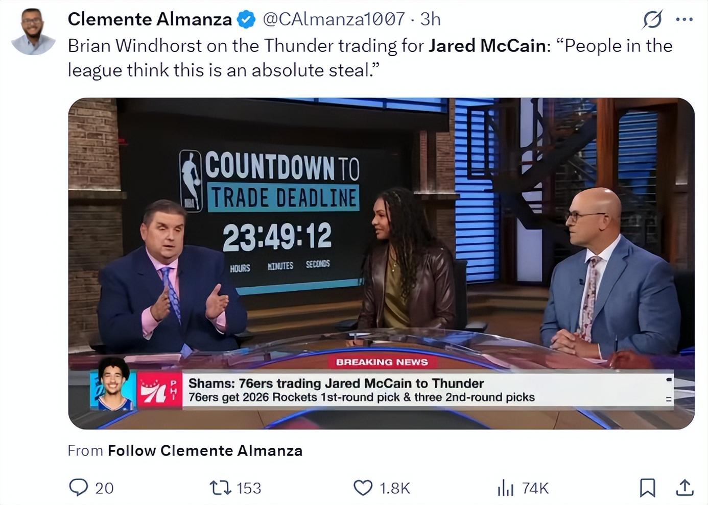 ESPN記者布萊恩-文霍斯特在播客節目中這樣說道:聯盟內部人士普遍認爲,雷霆4換1得到麥凱恩是絕對划算的。他在節目中提到了4個要點,因爲篇幅太長,我這裏就精簡一下他的觀點: