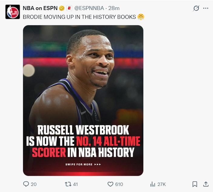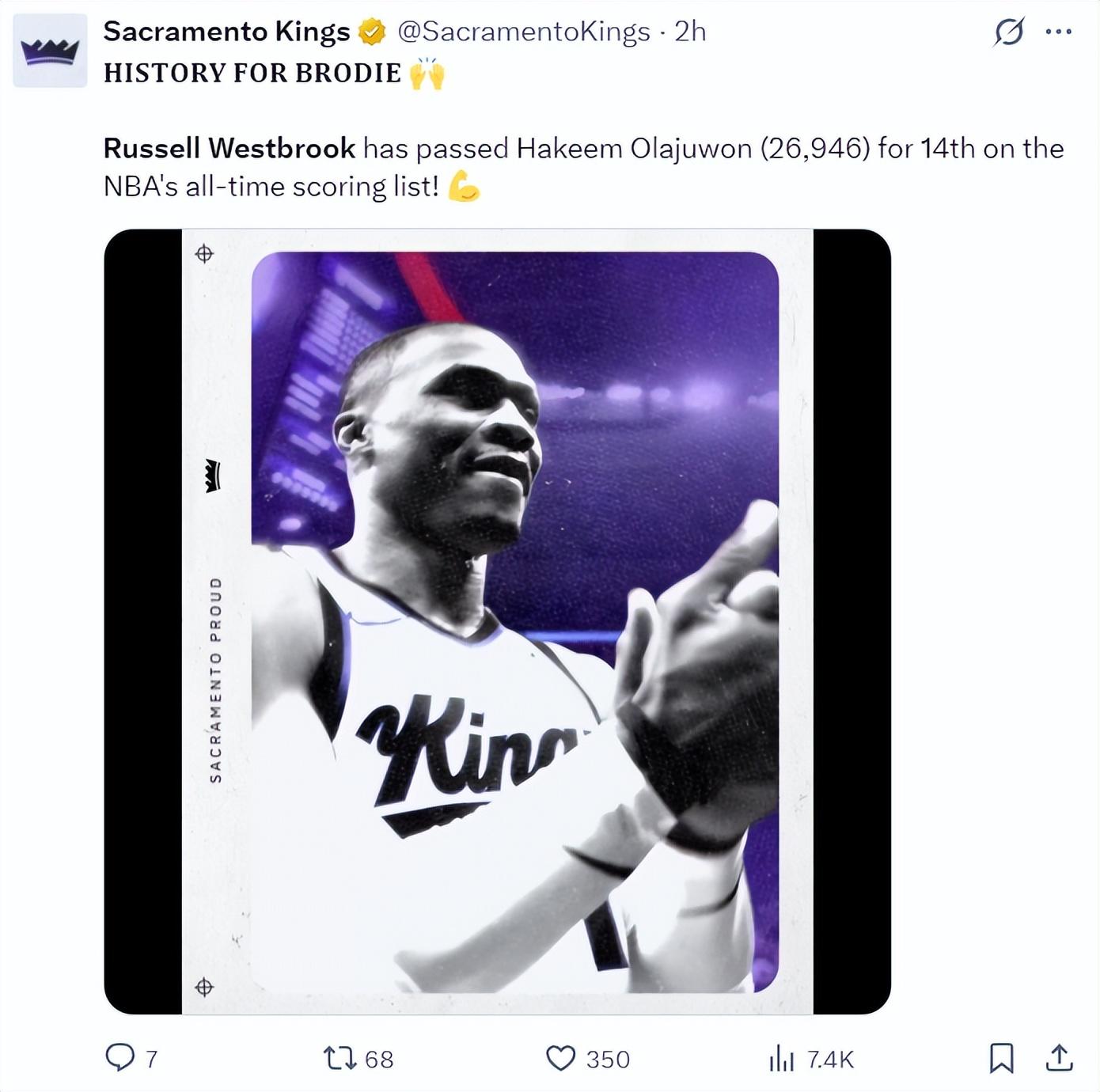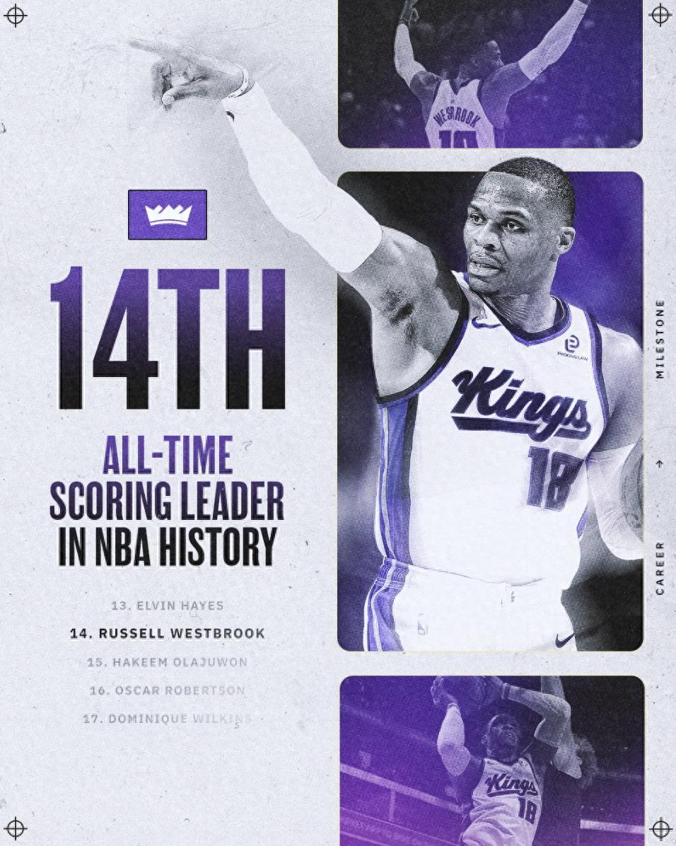 國王官方慶祝威少歷史總得分榜升至第14位,超越奧拉朱旺26946分,下一個將追逐埃爾文-海耶斯的27313分。