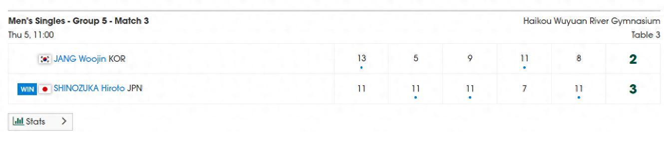 張禹珍在G5組,他連續兩日都吞下失利,第一場2-3惜敗郭勇,第二場2-3惜敗篠塚大登,張禹珍已經提前出局,G5組的篠塚大登、郭勇已經提前鎖定16強的席位,只不過這兩人最後一戰會決定小組第一與小組第二。