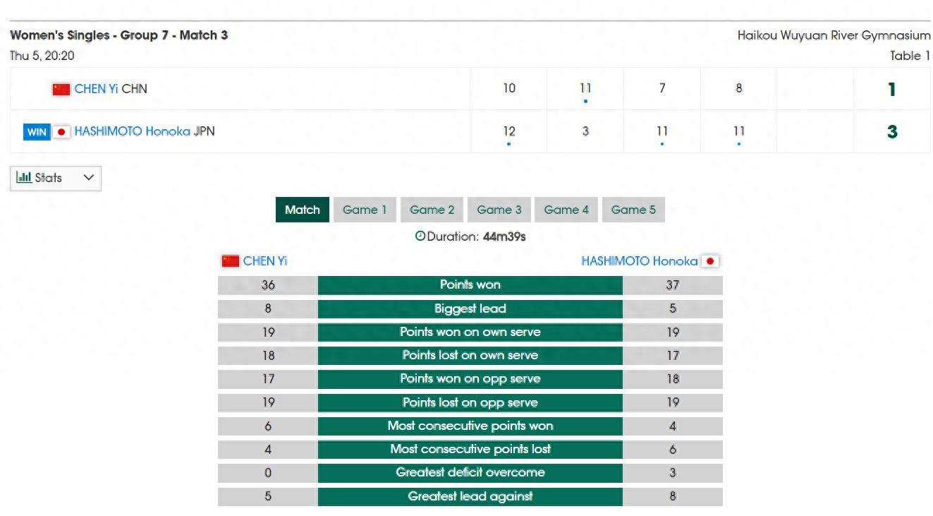 此役後橋本帆乃香二連勝小組第一,陳熠1勝1負小組第二,帕拉南1勝1負小組第三,陳熠最後一場的對手是陳昭澐,帕拉南最後一場的對手是帕拉南,所以整個G7組的形勢還未明朗,如果橋本輸給帕拉南,陳熠擊敗陳昭澐,那麼最後要去算小分決出小組第一。