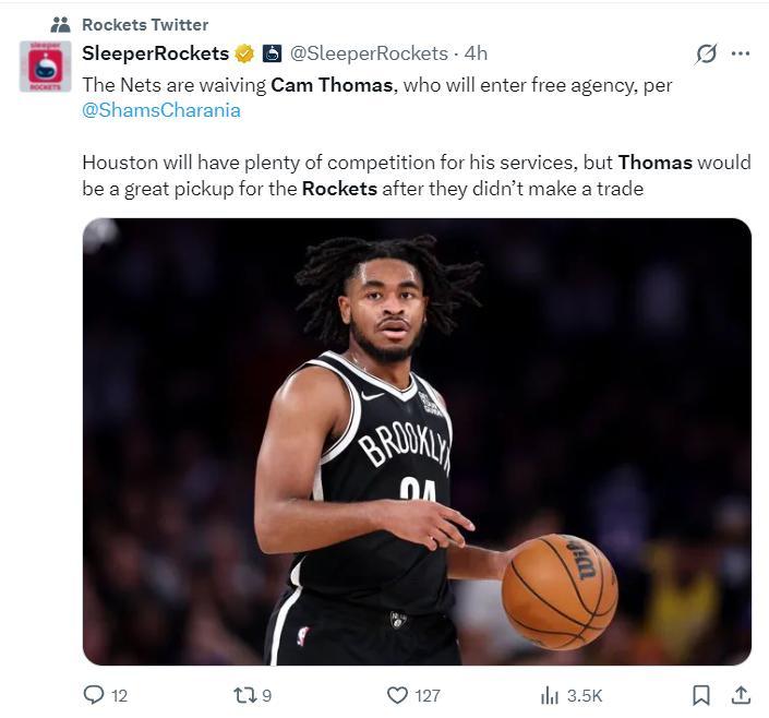 隨後休斯頓媒體SR跟蹤報道,籃網將裁掉托馬斯,他將進入自由球員市場,火箭隊在交易截止日沒有完成引援,火箭有意在買斷市場上籤下托馬斯,但火箭面臨不少球隊的競爭。(目前被曝出的還有雄鹿、湖人都有意托馬斯)