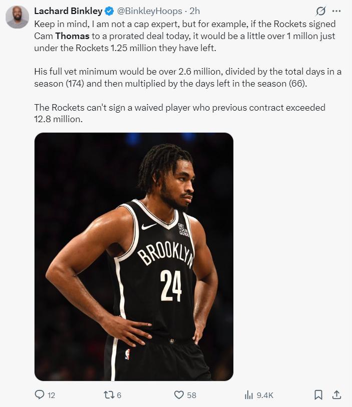 隨後他又寫道:我並非是一個薪資結構分析師,但如果火箭隊真的要簽下托馬斯,那麼他的年薪肯定會超過100萬,但目前火箭僅低於第一硬帽125萬美元,所以托馬斯的薪資最高不超過125萬。
