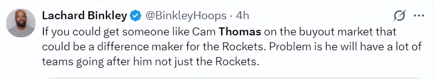 火箭隊記蘭德里-賓克利透露,如果能有像托馬斯這樣的球員加入買斷市場,那對火箭隊來說將會是重大利好。但問題是,會有很多球隊爭搶他,而不僅僅是火箭隊一家。