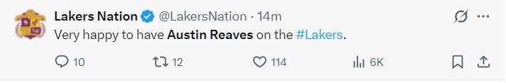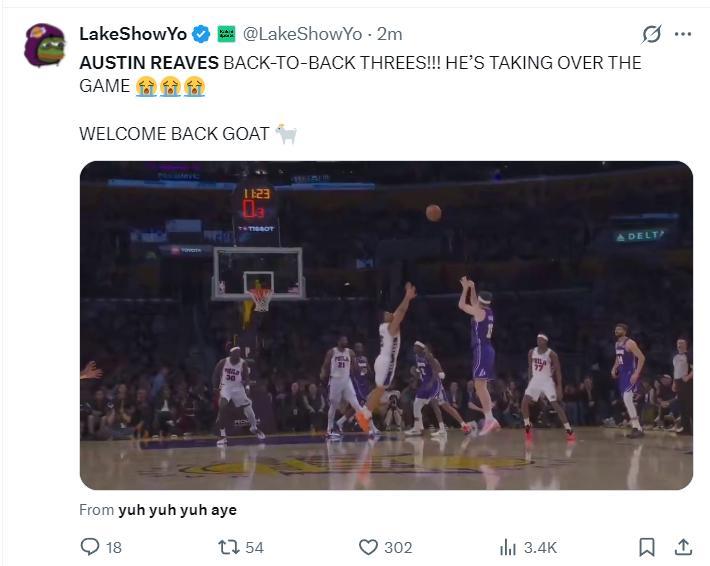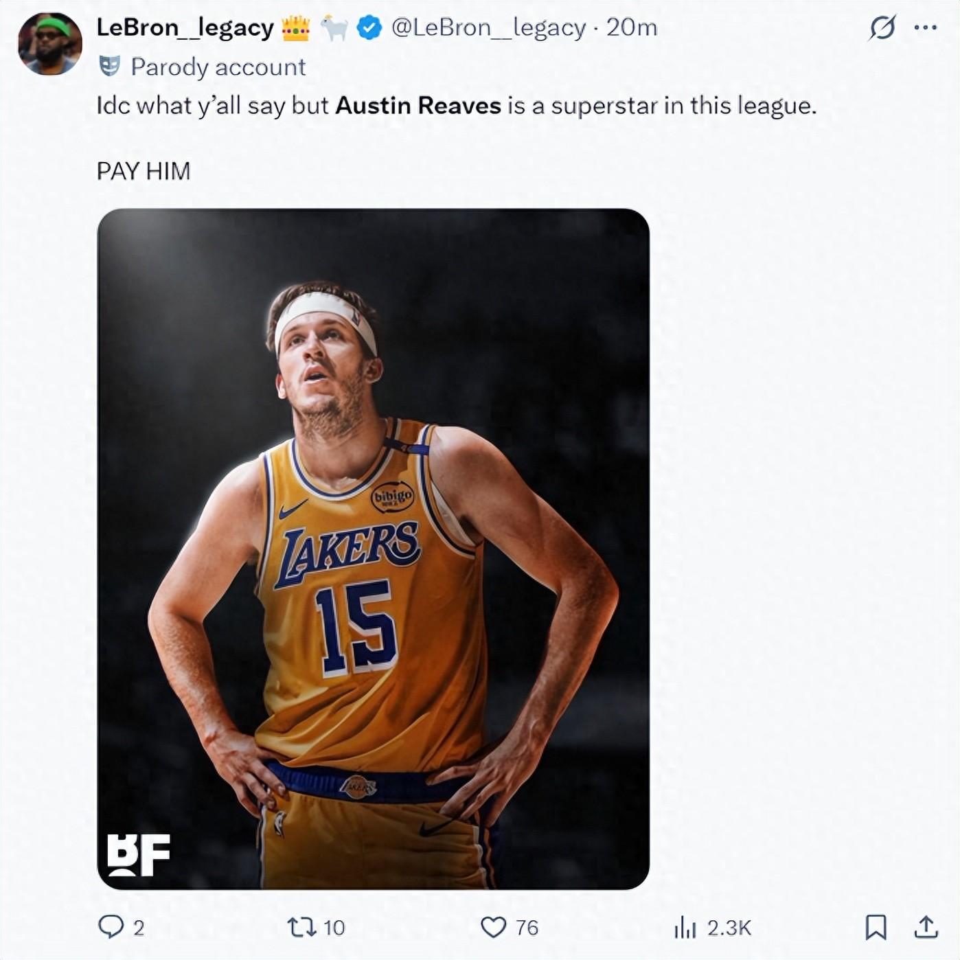 奧斯汀-裏夫斯實在是太出色了,末節開場湖人還在落後,但在短短1分06秒的時間裏裏夫斯一人打出了8-0的攻勢直接幫助湖人反超,湖人隊記邁克-特魯戴爾都覺得不可思議。