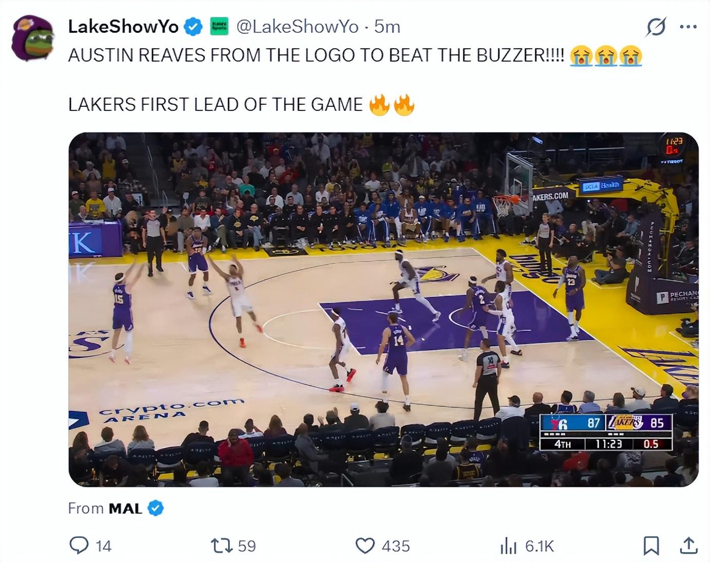 第三節剛開場,裏夫斯還剩0.5秒接球完成了一個壓哨的超遠三分,這是一個不沉球的超遠三分,湖人媒體都看哭了。