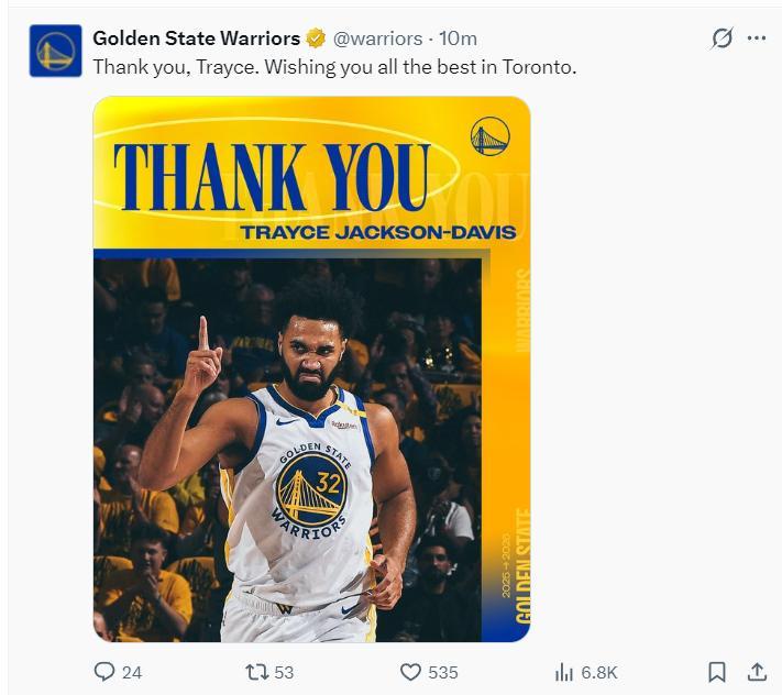 勇士官方感謝戴維斯,他被送到猛龍。