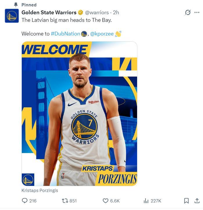 勇士官方宣佈交易達成歡迎波爾津吉斯到來。