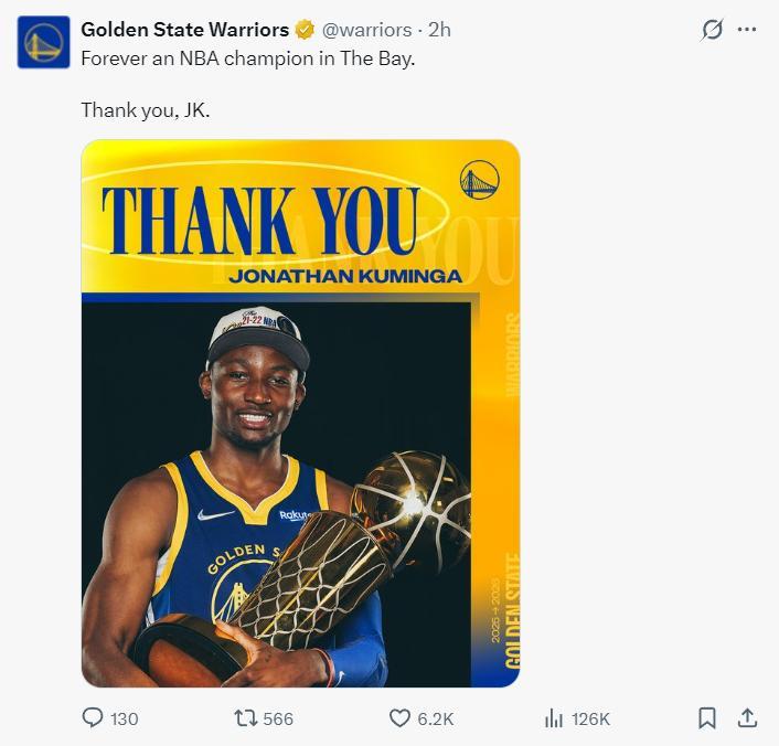 勇士官方也感謝了希爾德、庫明加,這兩被送到老鷹。