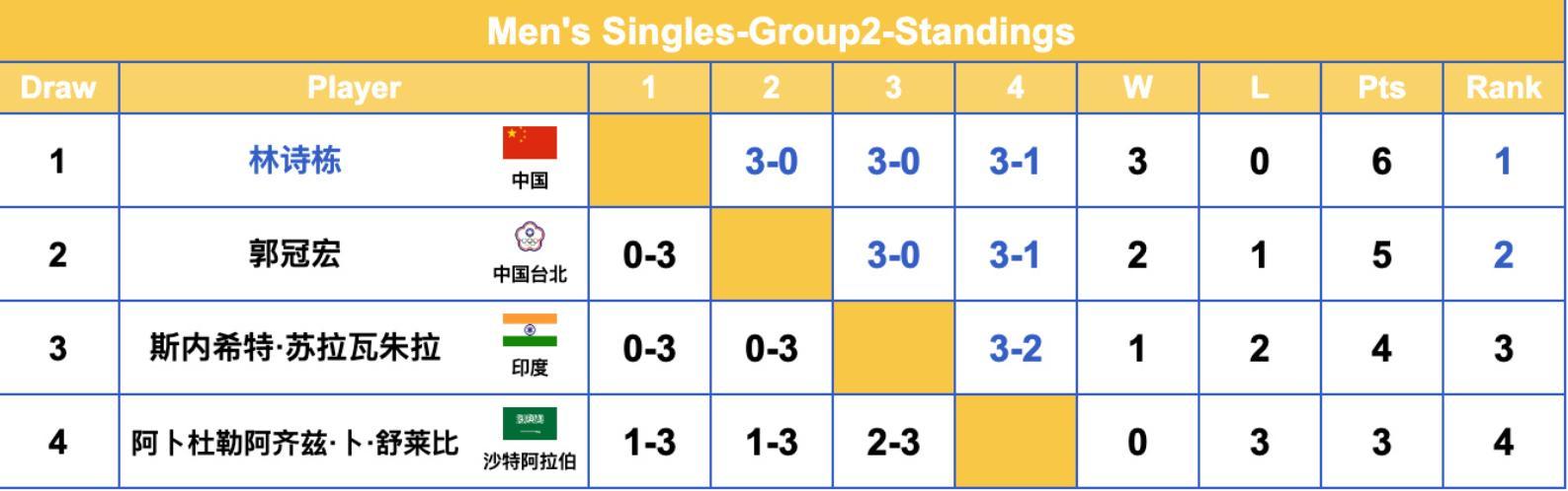 G2組,林詩棟以三連勝小組第一的身份晉級16強,兩場3-0與一場3-1;小組第二是郭冠宏,他以兩勝一負晉級16強。