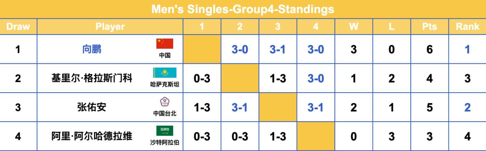 G4組,向鵬以三連勝鎖定小組第一,兩場3-0與3-1;小組第二的張佑安2勝1負晉級16強。
