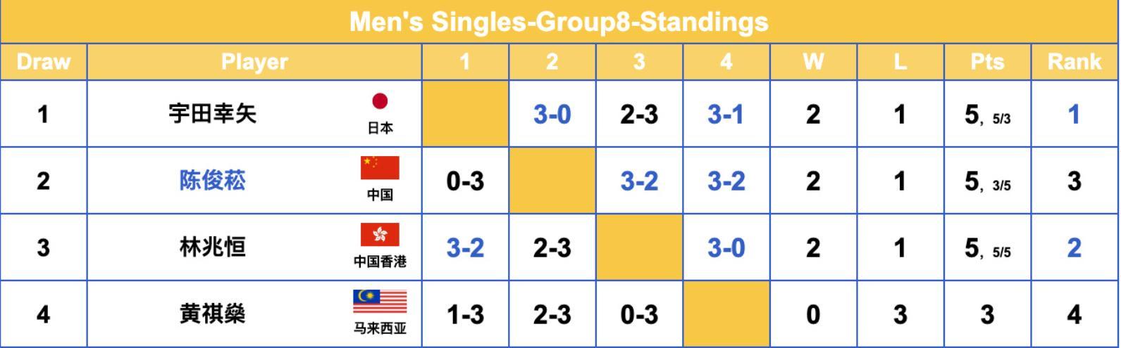 G8組,國乒小將陳俊菘2勝1負但因爲算小分被淘汰,小組第一是日乒名將宇田幸矢2勝1負,小組第二是林兆恆2勝1負,這兩人都是以小分晉級,陳俊菘不敵宇田幸矢那場太致命。