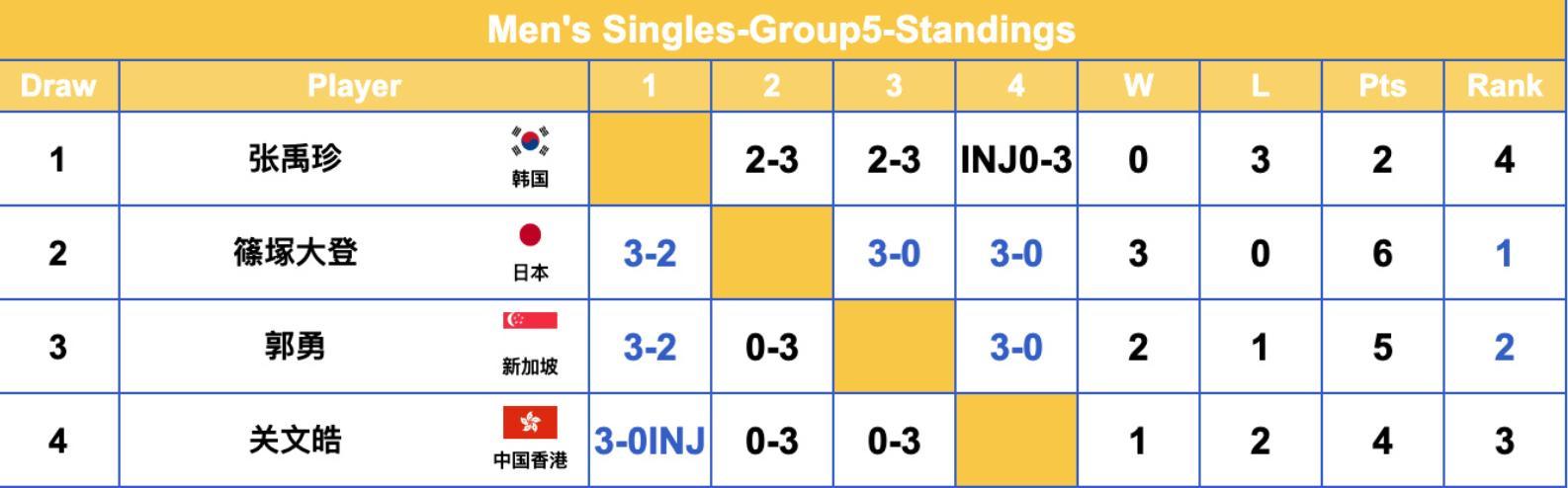 G5組,篠塚大登以三連勝鎖定小組第一,兩場3-0與一場3-2;郭勇以兩勝一負鎖定小組第二晉級。韓乒一哥張禹珍吞下三連敗小組墊底。