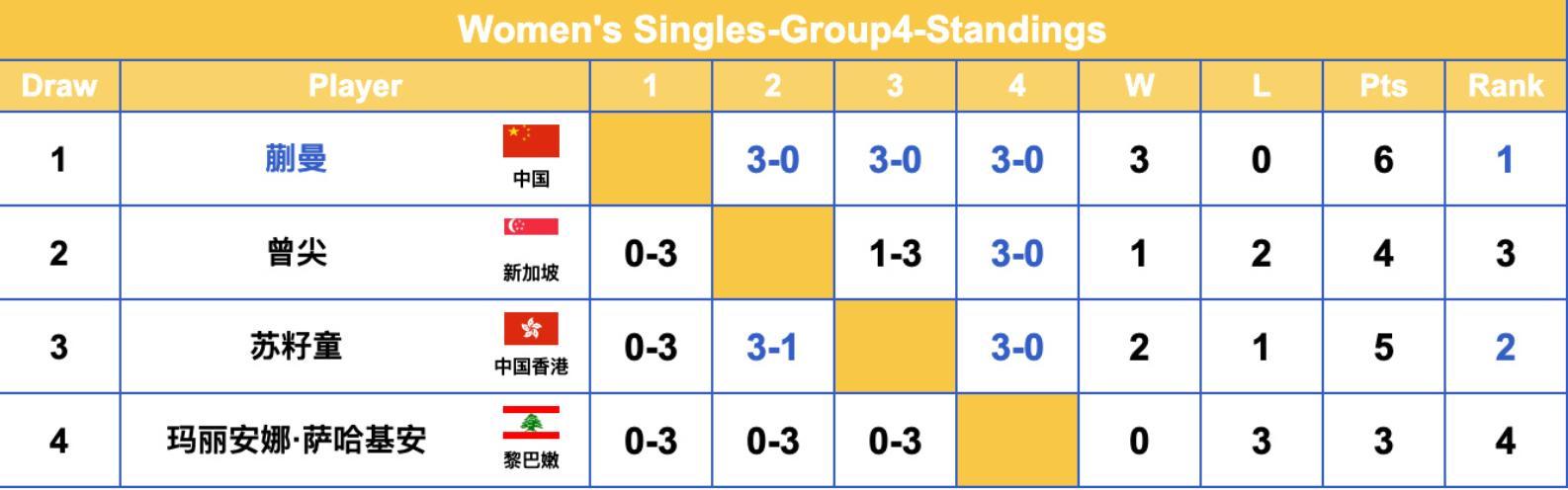 G4組,蒯曼三連勝(而且都是3-0)以小組第一的身份晉級16強,蘇籽童則是以2勝1負小組第二啥的身份晉級;曾尖1勝2負小組第三、薩哈基安三連敗被淘汰;