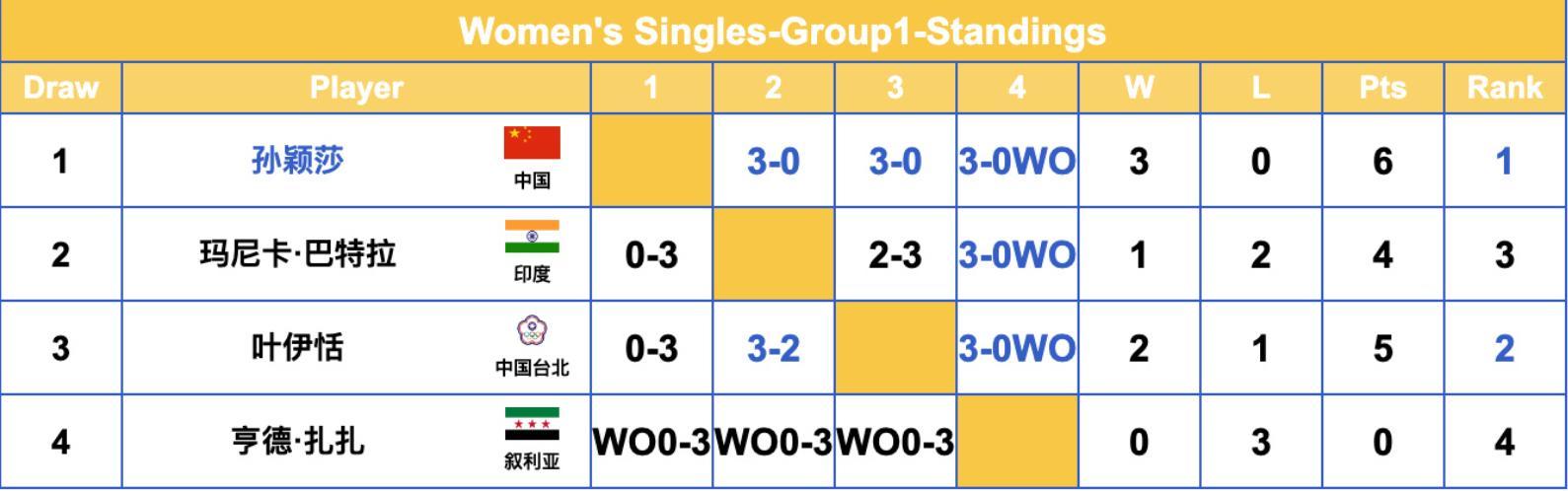G1組,孫穎莎豪取三連勝(都是3-0)以小組第一的身份晉級16強,葉伊恬則拿到2勝1負以小組第二的身份晉級;印度女王巴特勒1勝2負、扎扎3連敗都被淘汰;