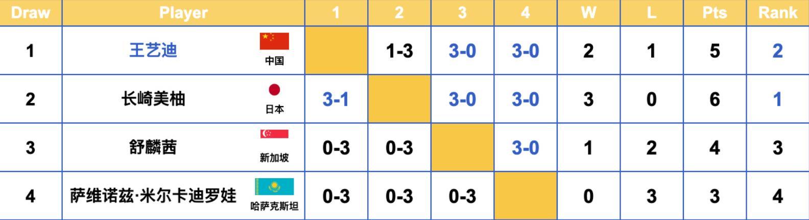 G5組,長崎美柚以三連勝(2場3-0、1場3-1)的身份晉級16強,中國選手王藝迪則以2勝1負小組第二的身份晉級,舒麟茜1勝2負、米爾卡迪羅娃三連敗被淘汰;