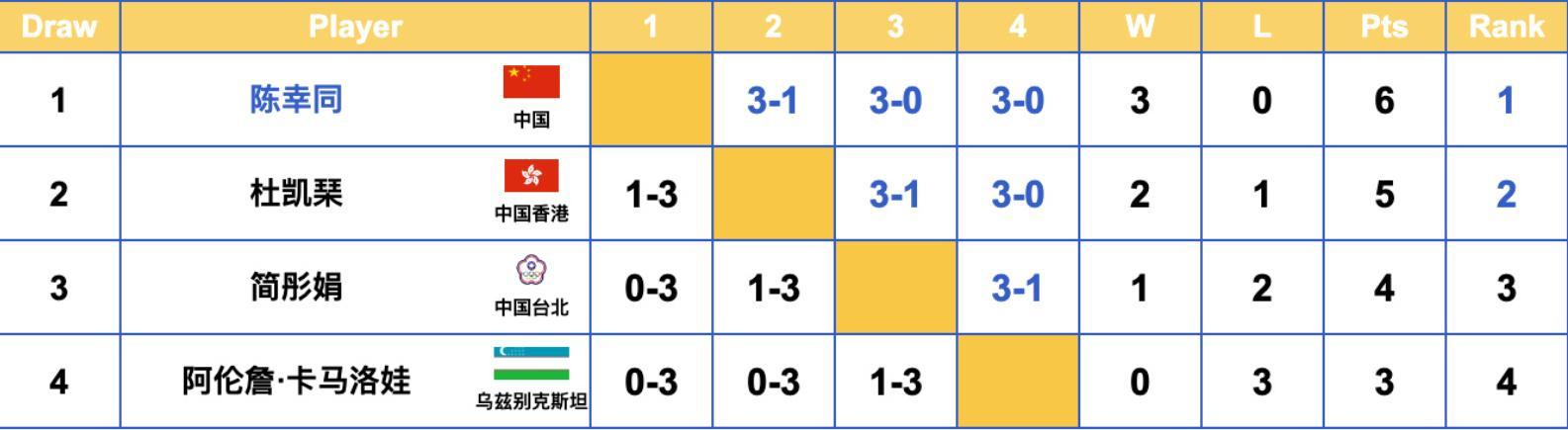 G3組,陳幸同以三連勝(2場3-0、1場3-1)以小組第一的身份晉級16強,杜凱琹則以2勝1負小組第二的身份晉級;高彤娟1勝2負、卡瑪洛娃3連敗都被淘汰。