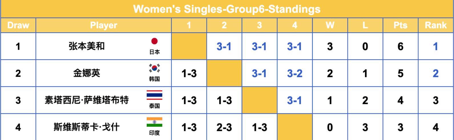 G6組,張本美和三連勝鎖定小組第一晉級16強(三場比賽都是3-1);韓國核心金娜英2勝1負以小組第二的身份晉級。薩維塔布特、戈什都被淘汰。