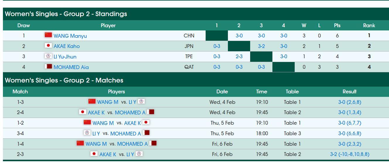 G2組,王曼昱豪取三連勝以小組第一的身份晉級16強,日乒小將赤江夏星以兩勝一負小組第二的身份晉級,穆罕默德、李昱諄被淘汰。
