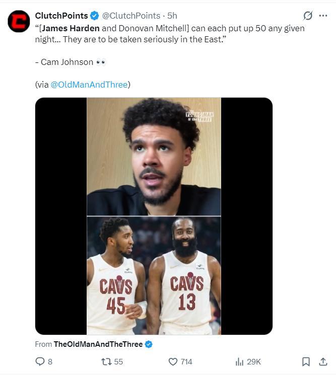 掘金球員卡梅倫-約翰斯在直播時談到哈登+米切爾的組合,他表示:騎士隊會變得非常強大,因爲哈登、米切爾兩人都是可以一場50+的球員,米登組合會非常之恐怖。