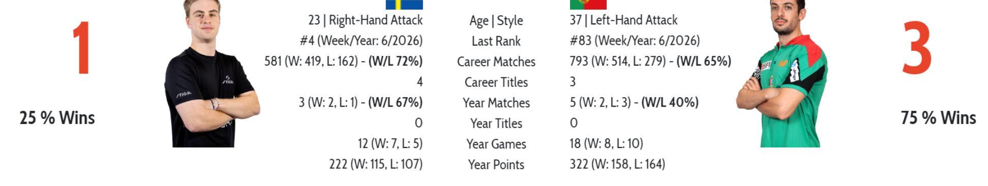這場比賽後莫雷加德與弗雷塔斯的交手戰績改寫爲1勝4負,唯一贏下的那場比賽還是2025年的歐洲盃,自2019年-2026年小莫在面對這位老將只贏下1場比賽,看起來6年的魔咒又將延續下去,乒乓球這個項目真的不是世排低就能力差吧。
