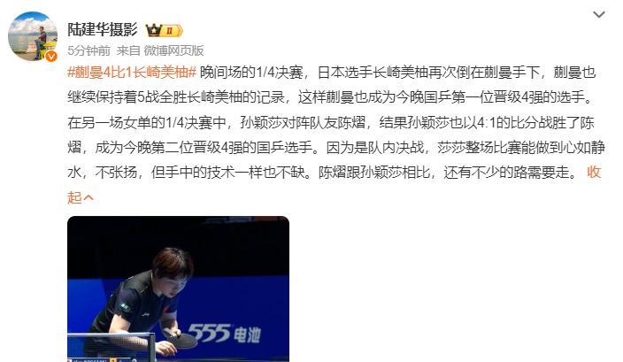 北京時間2月7日,亞洲盃女單1/4決賽,蒯曼4-1擊敗長崎美柚晉級四強,五局比分:11-6,11-6,6-11,11-5,11-4。此役後孫穎莎4-1擊敗陳熠,上半區的半決賽對陣出爐:孫穎莎VS蒯曼。