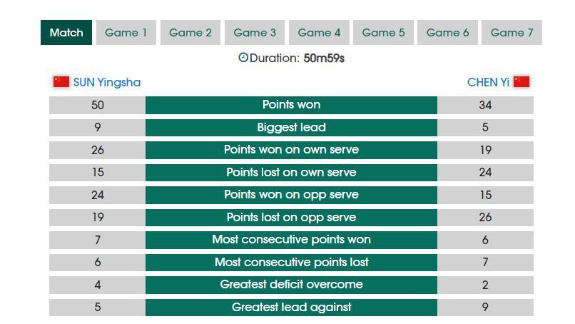 這場比賽可以看出孫穎莎與陳熠的差距有多大,每一項數據都佔優,陳熠的自失非常多。此前陳熠在第一階段的循環賽中爆冷不敵長崎美柚,當時韓瑩的丈夫就說陳熠不管是靈活度、正反手的技巧與孫穎莎的差距都很大,這場比賽打完後更加印證了這個觀點。