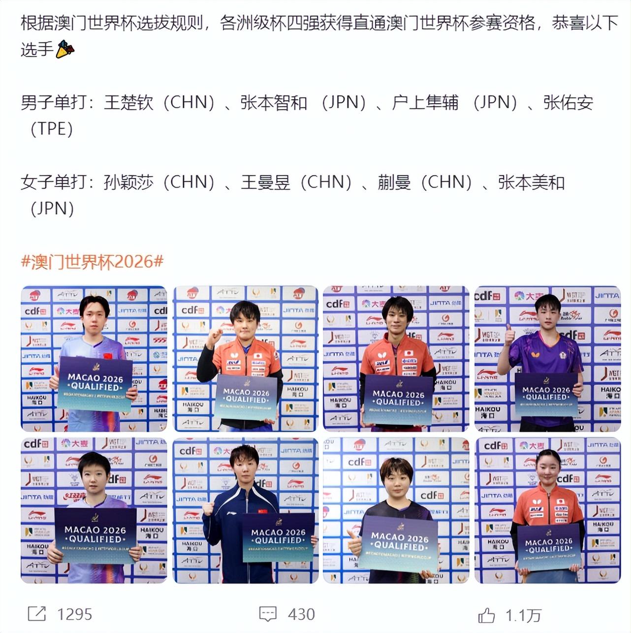 亞洲盃單打四強直通澳門世界盃,男單:王楚欽、張本智和、戶上隼輔、張佑安;女單:孫穎莎、蒯曼、王曼昱、張本美和。換言之世界第二的林詩棟無緣直通澳門世界盃,林詩棟的沮喪肉眼可見。