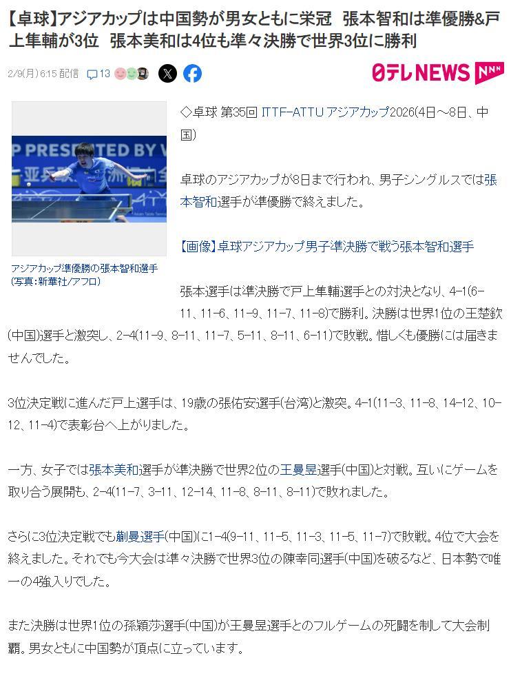 北京時間2月9日晨,日本媒體總結了日乒本次亞洲盃,中國隊囊括男女單兩枚金牌,日本隊女單最好成績是張本美和的第四名,中國隊包攬女單的冠亞季軍(孫穎莎、王曼昱、蒯曼)。
